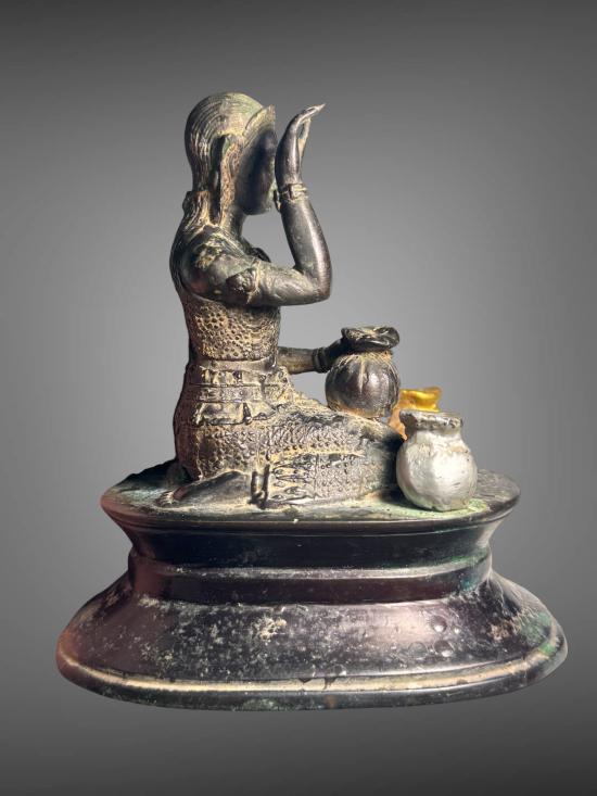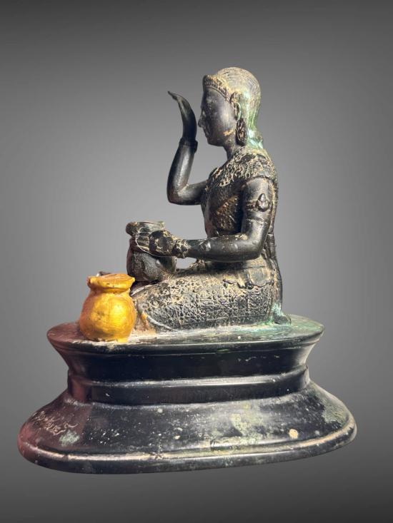 นางกวักเจ้าทรัพย์ หลวงปู่หงษ์ พรหมปัญโญ สุสานทุ่งมน จ.สุรินทร์ เนื้อโลหะรมมันปู ผิวหิ้ง !! ฐานขนาด 3.5 นิ้ว X 5.5 นิ้ว หน้าตัก 1.5 นิ้ว สูงรวมฐาน 6 นิ้ว ตอกโค๊ต ยันต์ ตอกเลข ** ชานหมากหลุดหาย ** |