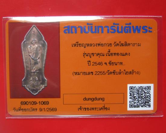 เหรียญหลวงพ่อกวย วัดโฆสิตาราม รุ่นบูชาคุณ เนื้อทองแดง ปี 2546 พร้อมบัตรรับรองพระแท้ เบอร์ 2255 |