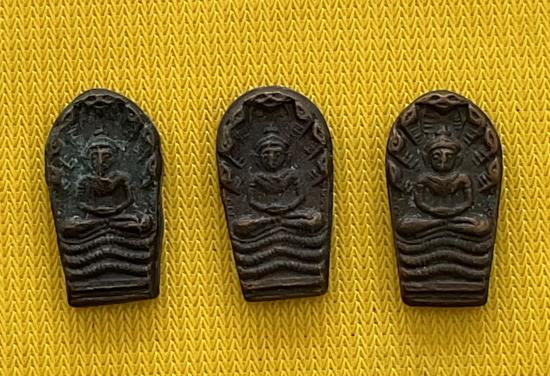 พระปรกใบมะขามหลวงปู่แหวนออกวัดสัมพันธวงค์ ปี 2520 เนื้อทองแดง 3 องค์ |