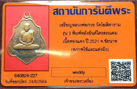 หลวงพ่อกวย หลังยันต์ ปี 21 เลี่ยมทอง 60-75