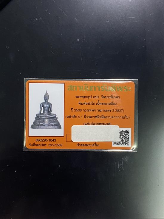 พระพุทธรูป ภปร. วัดบวรนิเวศฯ พิมพ์หนังไก่ เนื้อทองเหลือง ปี 2508 กรุงเทพฯ (หมายเลข 3 3837) (หน้าตัก 5.1 นิ้ว ) + บัตร g pra ครับ