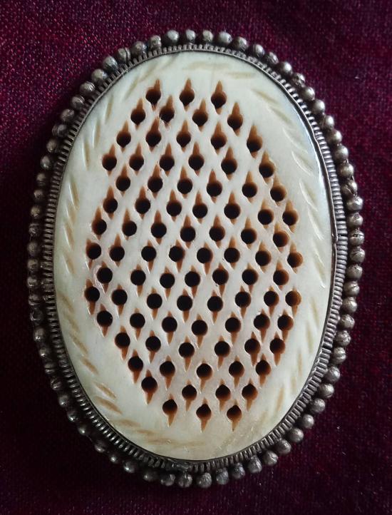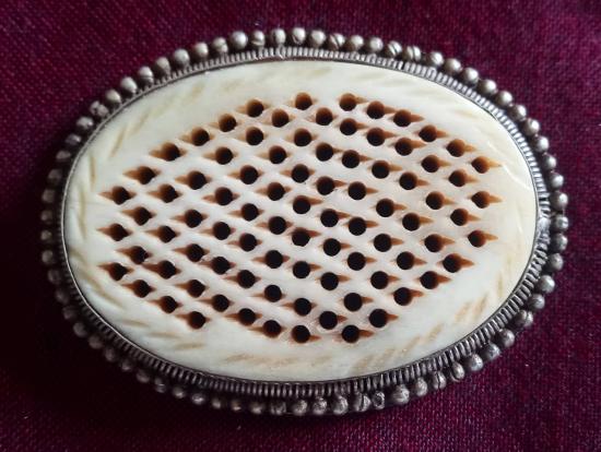 กรามช้างฉลุลาย เลี่ยมเงินผสม หรือแปะตั๊ง งานฝีมือรุ่นเก่า ขนาดประมาณ 2.5 นิ้ว X 1 นิ้ว 7 หุน X 3 หุน (ขนาดประมาณทำหัวเข็มขัดกำลังสวย) สภาพสวยตามรูป ส่งฟรีทั่วไทย รับประกันตามกฎครับ