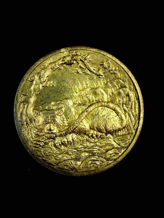 250... เหรียญเสาร์ 5 พญาเสือเฒ่า (พญาเสือนอนกิน) พระอาจารย์ประสูติ วัดถ้ำพระพุทธโกษีย์ (วัดในเตา) เนื้อทองฝาบาตร |