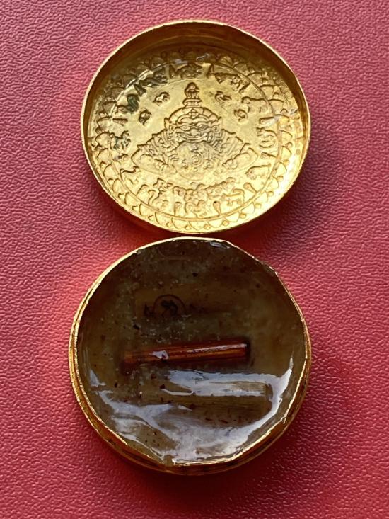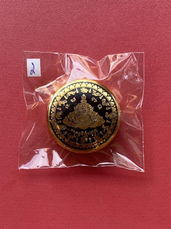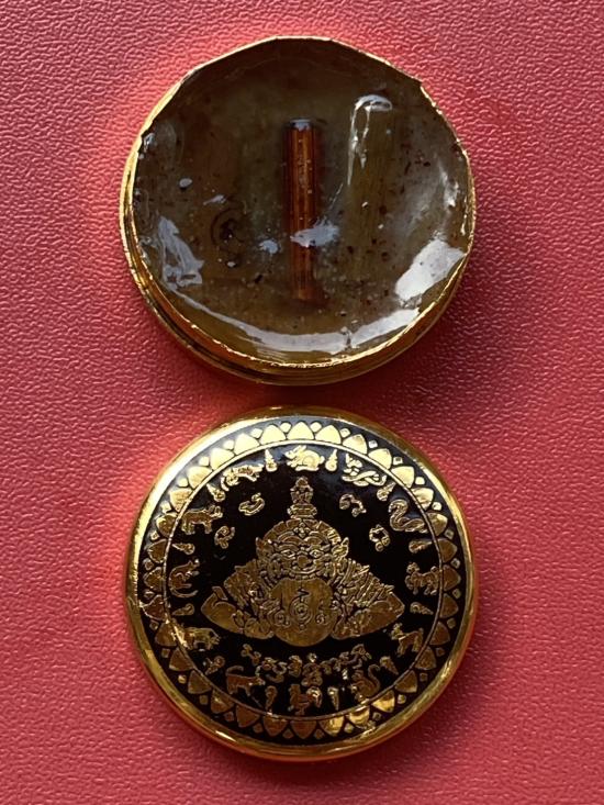 เคาะเดียวแดง สีผึ้งพระราหู รุ่น มงคลจักรวาล เนื้อ โลหะชุบทองลงยาสีดำขอบสีดำ ขนาด3.2ซม |