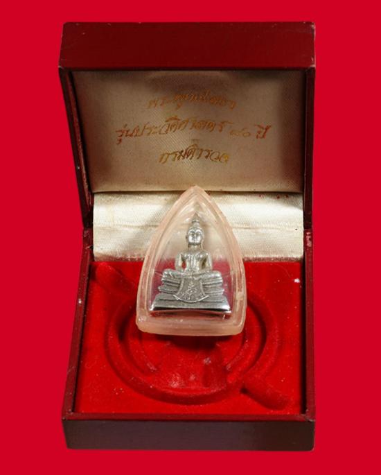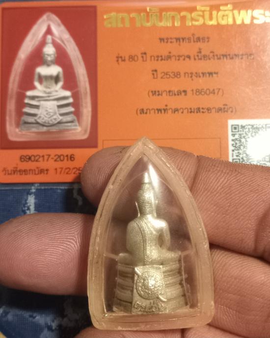 เคาะเดียวแดง+++หลวงพ่อพระพุทธโสธร รุ่น 80 ปี กรมตำรวจ เนื้อเงินพ่นทราย ปี 2538 กรุงเทพฯ (หมายเลข 186047) สวยเดิมๆ จมูกโด่ง มีเส้นคอ มีกล่องเดิมๆ มีบัตรรับรองพระแท้สภาพทำความสะอาดผิว