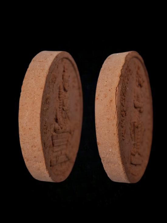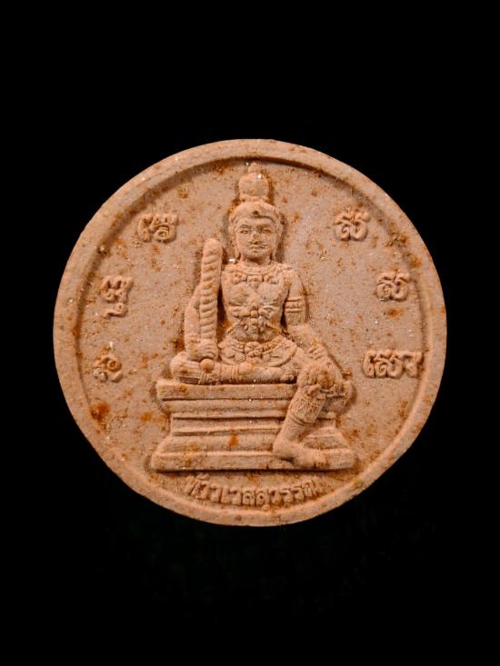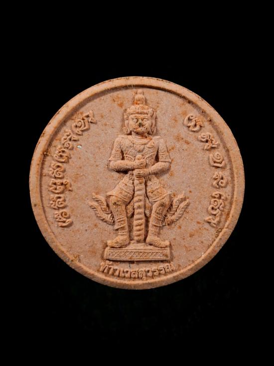 พระผงจันทร์ลอย ท้าวเวสสุวรรณ ปางยืน และ ปางนั่ง ถือกระบอง พระมีขนาดกว้าง 3.35 cm ความสูง 3.35 cm