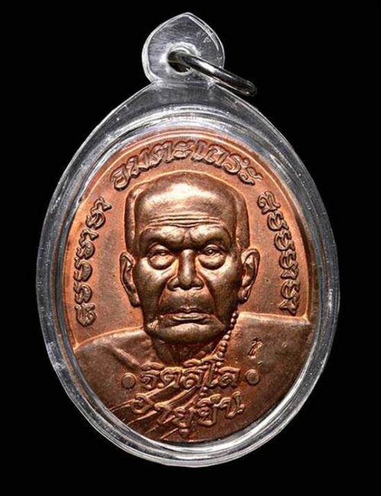 เหรียญอายุยืน หลวงปู่หมุน วัดบ้านจาน เนื้อทองแดง ผิวไฟแดง ๆ ปี 2546 เลี่ยมกันน้ำพร้อมขึ้นคอ