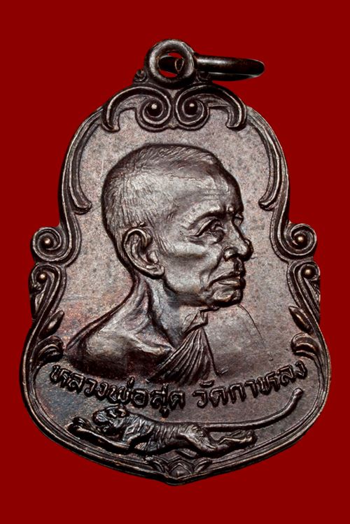 เหรียญหลวงพ่อสุด วัดกาหลง " พิมพ์น้ำเต้า บล็อคนิยมรางคู่ " เนื้อทองแดง ปี 2525 จ.สมุทรสาคร+บัตรรับรอง |