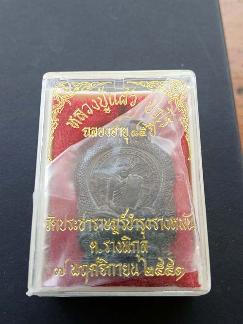 เหรียญนั่งพาน หลวงปู่แผ้ว ปี 2551 วัดรางหมัน เนื้อทองแดง กล่องเดิม |