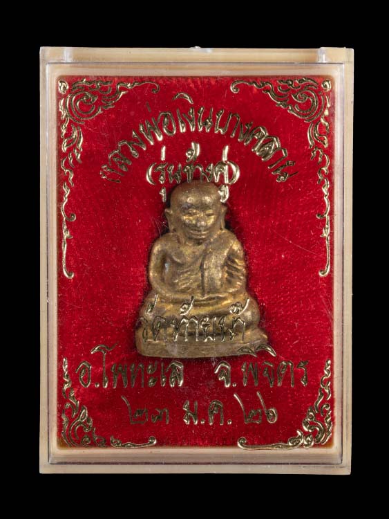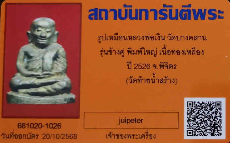 รูปเหมือนหลวงพ่อเงิน วัดบางคลาน รุ่นช้างคู่ พิมพ์ใหญ่ เนื้อทองเหลือง ปี 2526 จ.พิจิตร (วัดท้ายน้ำสร้าง) พร้อมบัตรรับรองการันตรีพระ