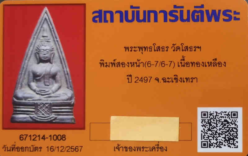 พระพุทธโสธร วัดโสธรวราราม พิมพ์สองหน้า(6-7/6-7) เนื้อทองเหลือง ปี 2497 จ.ฉะเชิงเทรา มีบัตรรับรองการันตรีพระ