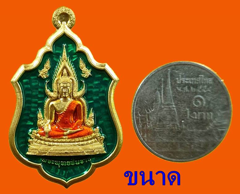 เหรียญโล่ห์พระพุทธชินราช หลังยันต์วิเศษอกเลาโภคทรัพย์ เนื้อทองทิพย์ลงยาสีเขียว เหนี่ยวทรัพย์ รุ่น สมโภชพระพุทธชินราช ครบ ๖๖๖ ปี