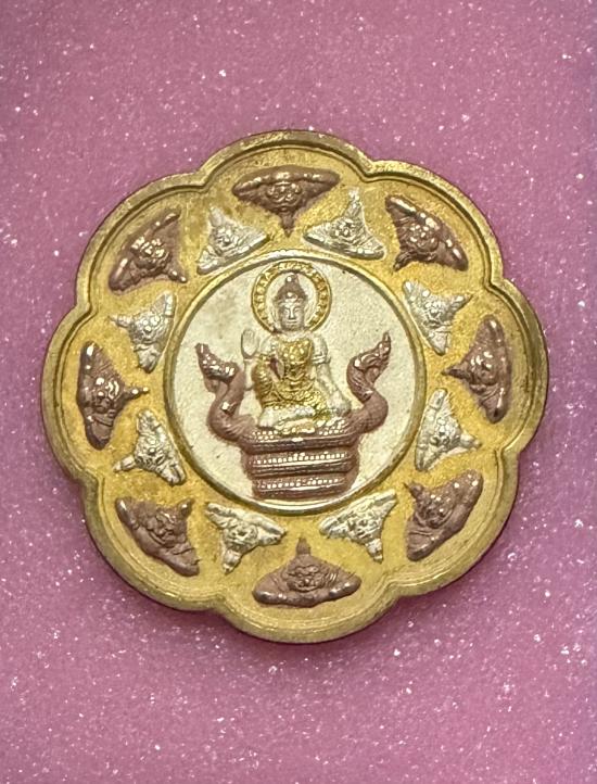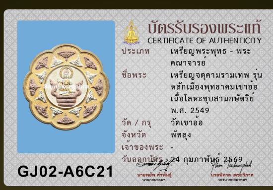 เหรียญจตุคามรามเทพ รุ่นหลักเมืองพุทธาคมเขาอ้อ วัดเขาอ้อ เนื้อโลหะชุบสามกษัตริย์ ปี 2549 พร้อมบัตรรับรองสมาคม