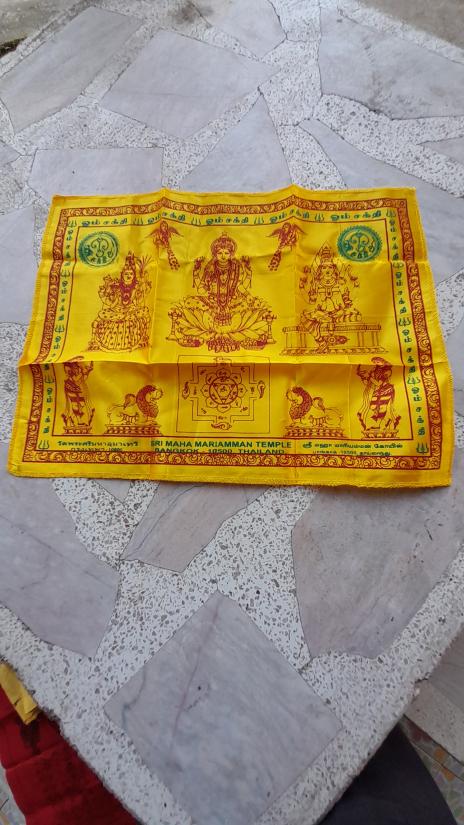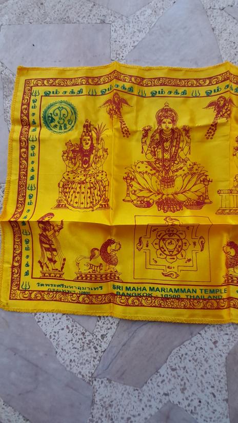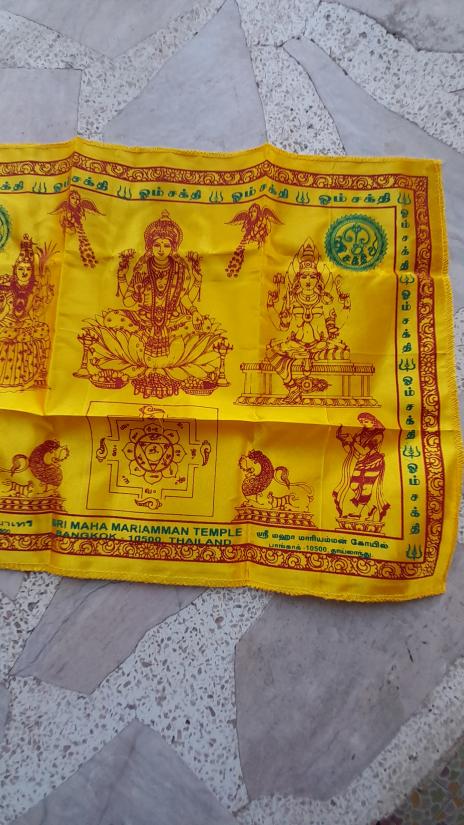 วัดใจเคาะเดียว.......100......ผ้ายันต์ พระแม่อุมาเทวี วัดพระศรีมหาอุมาเทวี(วัดแขกสีลม) ขนาดประมาณ 13 X 17 นิ้ว สีเหลืองสวยมันเงางาม |