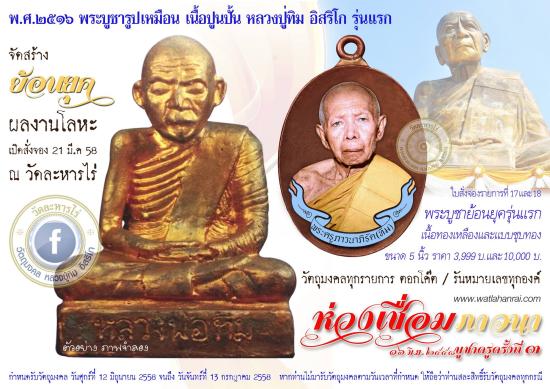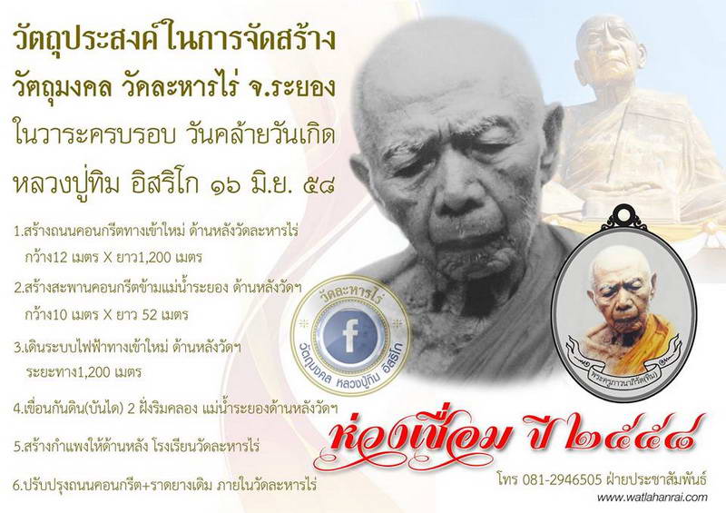 จัดสร้างโดย วัดละหารไร่ วัตถุประสงค์ดี แกะทรงพิมพ์ได้สวยมาก เหมือนหลวงปู่ทิมมาก และมีชนวนมวลสารเก่าที่หลวงปู่ทิม ปลุกเสกไว้ แถมปลุกเสก โดยพระเกจิอาจารย์ชื่อดัง และพระเกจิอาจารย์สายหลวงปู่ทิมจำนวนมาก พิธีใหญ่ปลุกเสกโบสถ์ วัดละหารไร่
