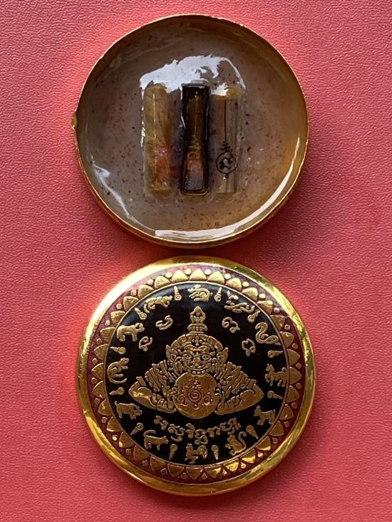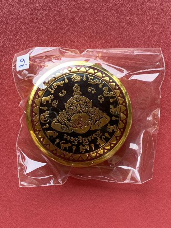 เคาะเดียวแดง สีผึ้งพระราหู รุ่น มงคลจักรวาล เนื้อ โลหะชุบทองลงยาสีดำขอบสีแดง ขนาด5ซม |