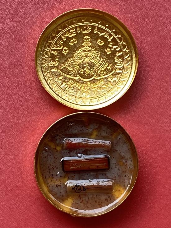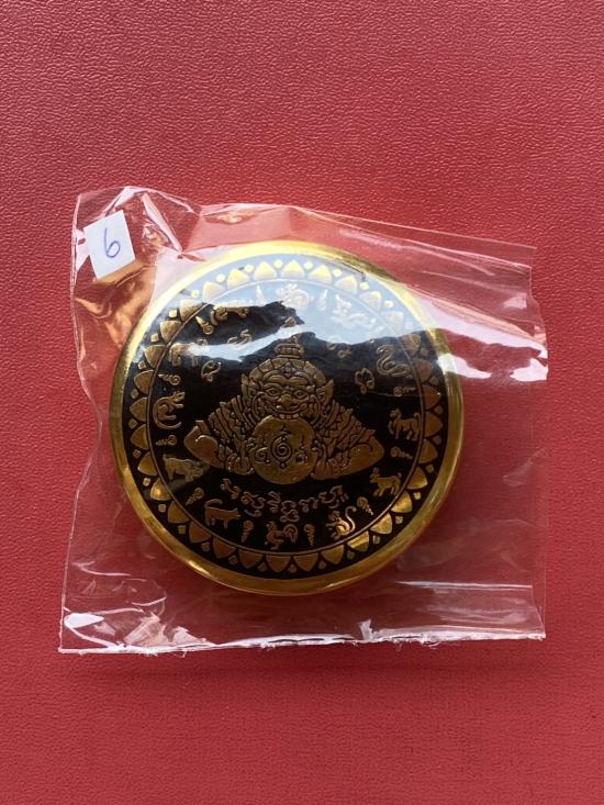 เคาะเดียวแดง สีผึ้งพระราหู รุ่น มงคลจักรวาล เนื้อ โลหะชุบทองลงยาสีดำขอบสีดำ ขนาด5ซม |