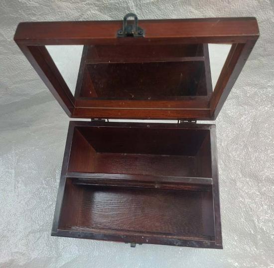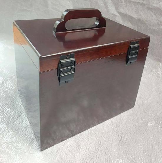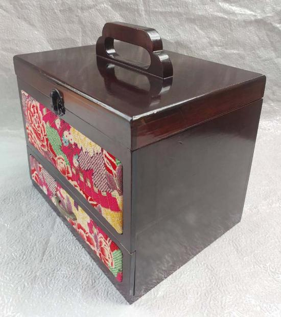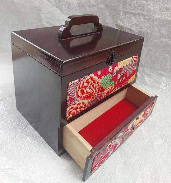 กล่องไม้โบราณสไตล์ญี่ปุ่น ทำจากไม้เคลือบเงา ตกแต่งด้วยผ้าทอกิโมโน 1 ลิ้นชัก ขนาด 9.5*7 สูงรวมหู 9.5 นิ้ว |