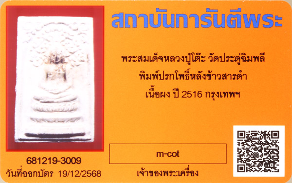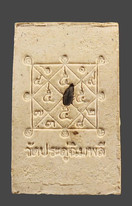 พระสมเด็จปรกโพธิ์ จัดสร้างในปี2516 ด้านหลังฝังข้างสารดำที่ได้มาจากกรุเจดีย์เก่าในจังหวัดกำแพงเพชร หลวงปู่เห็นว่าข้าวสารดำนี้เป็นของขลัง มีคุณวิเศษในตัว เมื่อนำมาฝังหลังพระเครื่องแล้วจะยิ่งทวีความศักดิ์สิทธิ์เป็นร้อยเท่าทวีคูณครับ...
