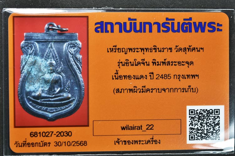 เหรียญพระพุทธชินราช อินโดจีน วัดสุทัศน์ พิมพ์สระอะจุด เนื้อทองแดง ปี2485 พร้อมบัตรรับรอง