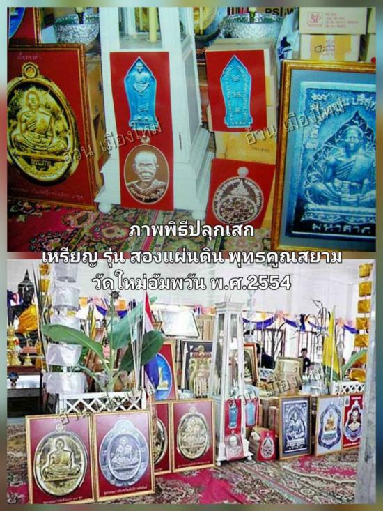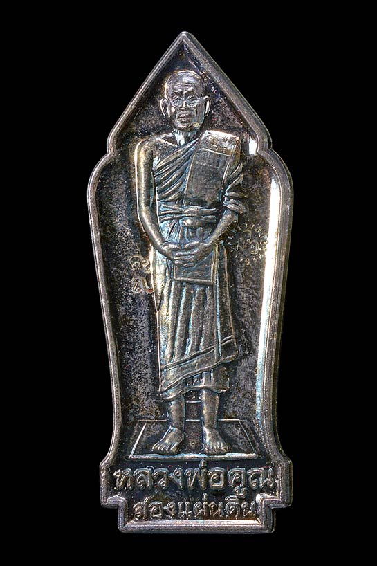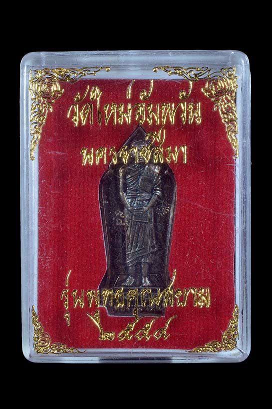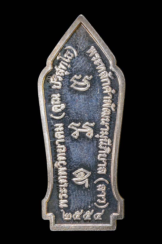 | เหรียญรูปเหมือนยืน รุ่น สองแผ่นดิน พุทธคูณสยาม ( เนื้อเงิน , 1.3 x 3.3 ซม. ) หมายเลข 58 พ.ศ.2554 ( กล่องเดิม ) |