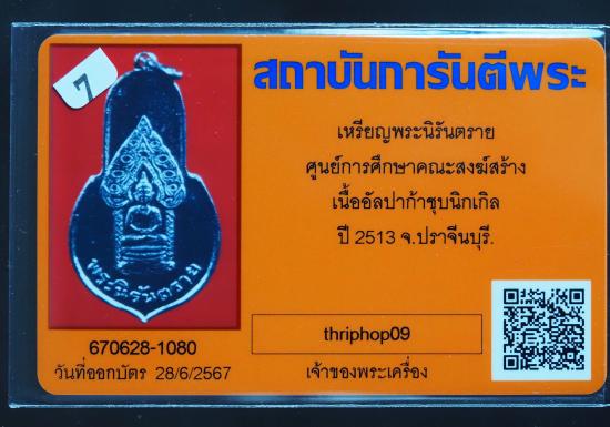 เหรียญนิรันตราย ศูนย์การศึกษาคณะสงฆ์ วัดหลวงปรีชากูล ปราจีนบุรี ปี พ.ศ.2513 เนื้ออัลปาก้าชุบนิเกิล พร้อมบัตรรับรอง