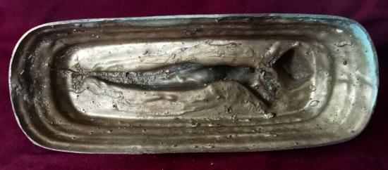 พระบูชา ปางไสยาสน์ ขนาดฐานเหลี่ยมประมาณ 10 นิ้ว 3 หุน X เกือบ 4 นิ้ว ประทับนอนบนบังลังก์บัวคว่ำบัวหงาย สลักชื่อผู้สร้าง และ วันเดือนปีที่สร้าง 22 มกราคม 2547 เนื้อทองเหลืองเก่าคร่ำ เกิดสนิมหยกที่พระพักตร์ และประปรายทั่วองค์พระ ผิวหิ้ง ตามุก ใต้ฐานมองเห็นแกนลวดหุ่นพระ ศิลป์สวย สภาพสวยตามรูป ส่งฟรีทั่วไทย รับประกันตามกฎครับ