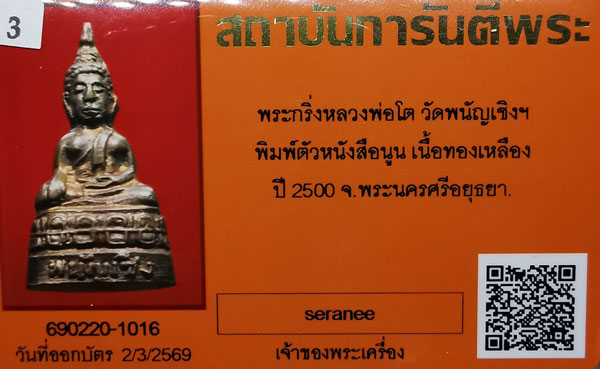 พระกริ่งหลวงพ่อโต วัดพนัญเชิง หนังสือนูน เนื้อทองเหลือง ปี2500 จ.พระนครศรีอยุธยา + บัตรG-pra สภาพสวยเดิมค่ะ |