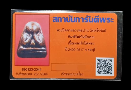 เคาะเดียวต่ำกว่าทุน...ปิดตาหลวงพ่อปาน วัดเครือวัลย์ ชลบุรี พิมพ์กลางหลังแบบ เนื้อผงลงรัก ปิดทองเดิม ยุคต้น ปี 2490-2517 พระสวยครับ พร้อมบัตรรับรองจากทางเว็บ |