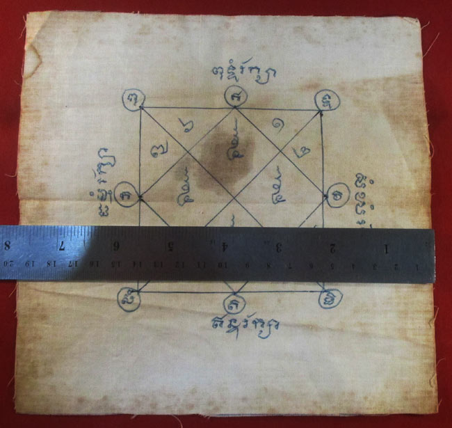 ผ้ายันต์ ไม่ทราบที่ จารยันต์ด้วยมือ เนื้อผ้าดูเก่า ครับ (พระบ้าน ครับ)