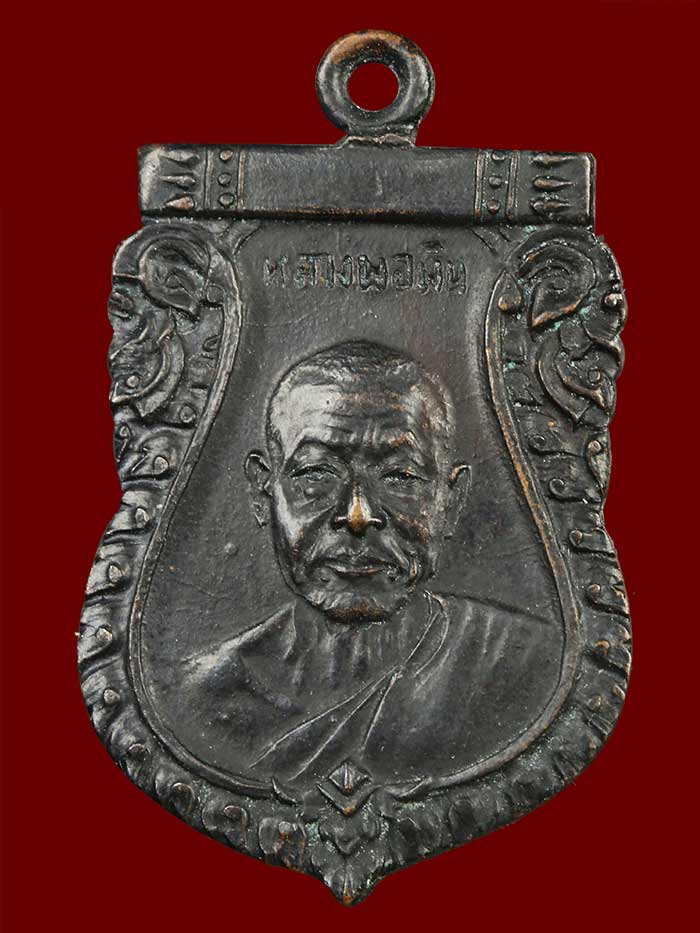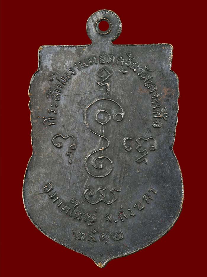 วัดใจ เหรียญเสมา หลวงพ่อเงิน วัดดอนยายหอม ออกวัดเกาะเสือ จ.สงขลา ที่ระลึกในงานทอดกฐินวัดเกาะเสือ เนื้อทองแดงรมดำ ปี2512