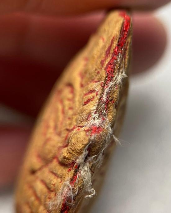 พระราหูอมจันทร์ ศิลปะสวย เป็นเนื้อผงคล้ายว่าน-ผงยาเป็นเสี้ยนๆ (ไม่ใช่ดิน) กดพิมพ์เป็นพระราหู สองแผ่นประกบกันครับ มีคราบชาดแดง แต่อาจหลุดเกือบหมดครับ