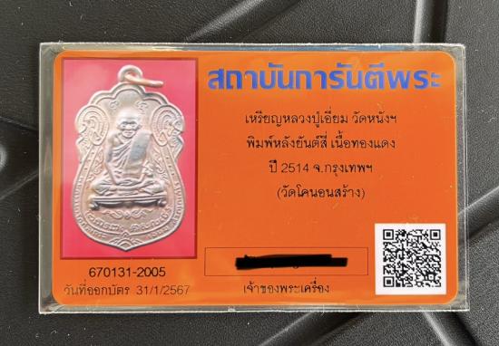 หลวงปู่เอี่ยม วัดหนังพิมพ์หลังยันต์สี่ เนื้อทองแดง ปี2514 พิมพ์นิยม (วัดโคนอนสร้าง)หลวงปู่โต๊ะปลุกเสก สภาพสวยเดิม พร้อมบัตร