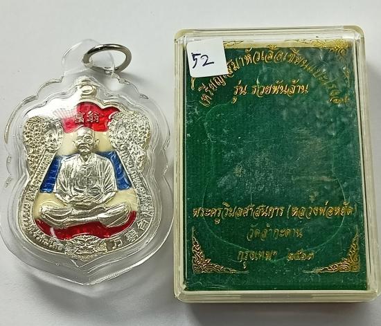 เหรียญเสมาหัวเสือ เซียนแปะโรงสี อาจารย์โง้วกิมโคย รุ่นรวยพันล้าน (หลวงพ่อหยัด) วัดลำกะดาน เนื้อเงินลงยาลายธงชาติ เบอร์ 52 พร้อมกล่องครับ (เหรียญขนาด4x3ซม. น้ำหนักรวมเลี่ยม 29.60กรัม) |