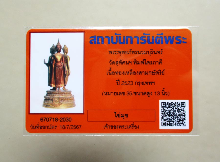 พระพุทธภัทรนวมบุรินทร์ พิธีมหาพุทธาภิเษก ณ.วัดสุทัศนฯ พ.ศ.2523 ชุดไตรภาคี ชนิดสามกษัตริย์ ตอกโค๊ต ตอกเลข เนื้อโลหะ ผิวหิ้ง พร้อมบัตรพระแท้การันตีพระ !!