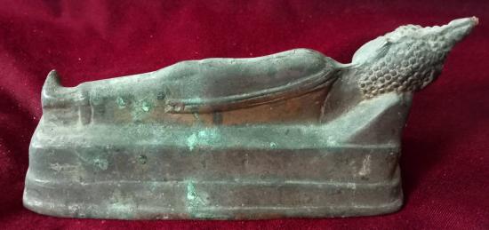 พระบูชา ปางไสยาสน์ ขนาดฐานเหลี่ยมประมาณ เกือบ 6 นิ้ว X เกือบ 2.5 นิ้ว ประทับนอนบนบังลังก์บัวหงาย เนื้อทองเหลืองเก่าคร่ำ เกิดสนิมหยกประปรายทั่วองค์พระ ผิวหิ้ง ใต้ฐานอุดดินไทยวรรณสองสี เทปูนทับมาเดิม ๆ สภาพสวยตามรูป ส่งฟรีทั่วไทย รับประกันตามกฎครับ