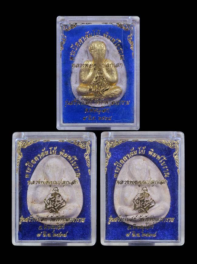 พระปิดตาจัมโบ้ พิมพ์โบราณ ( เนื้อผง 2 องค์ + เนื้อผงทารักปิดทอง 1 องค์ ) ปลุกเสกโดย หลวงพ่อคูณ รุ่น พุทโธ - ธัมโมรวย พ.ศ.2538 ( กล่องเดิม , รับพระ 3 องค์ )