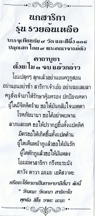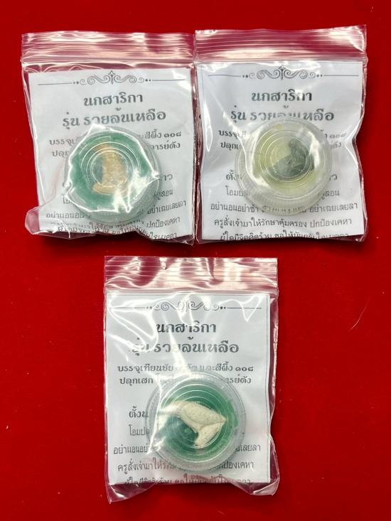 นกสาริกา รุ่นรวยล้นเหลือ บรรจุเทียนชัย 9 วัด และสีผึ้ง108 ปลุกเสกโดย 9 พระคณาจารย์ดัง (1กระดาน 3 อัน) |