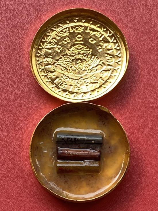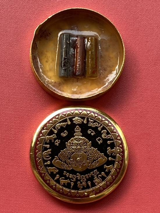 เคาะเดียวแดง สีผึ้งพระราหู รุ่น มงคลจักรวาล เนื้อ โลหะชุบทองลงยาสีดำขอบสีแดง ขนาด5ซม |