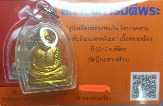 รูปเหมือนหลวงพ่อเงิน วัดบางคลาน พิมพ์บล๊อกแตกหลังแตก เนื้อทองเหลือง ปี2515 จ.พิจิตร พร้อมบัตรรับรอง