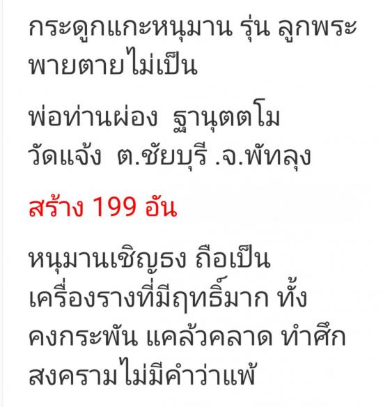 กระดูกแกะหนุมานเชิญธง "ลูกพระพรายตายไม่เป็น" พ่อท่านผ่อง ฐานุตตโม วัดแจ้ง พัทลุง จำนวนการสร้างน้อยมาก เพียง 199 อันเท่านั้น เลข ๘๑...พร้อมกล่อง องค์สุดท้ายแล้วครับ