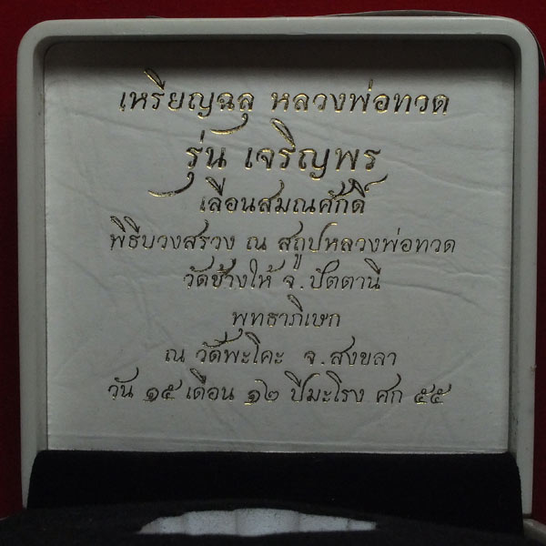 "วัดใจ" หลวงปู่ทวด เจริญพร เลื่อนสมณศักดิ์ วัดพะโคะ เหรียญเสมาฉลุ เนื้อนวะฯแก่ทองคำ หมายเลข ๑๔๔๘ สภาพสวยพร้อมกล่องเดิม