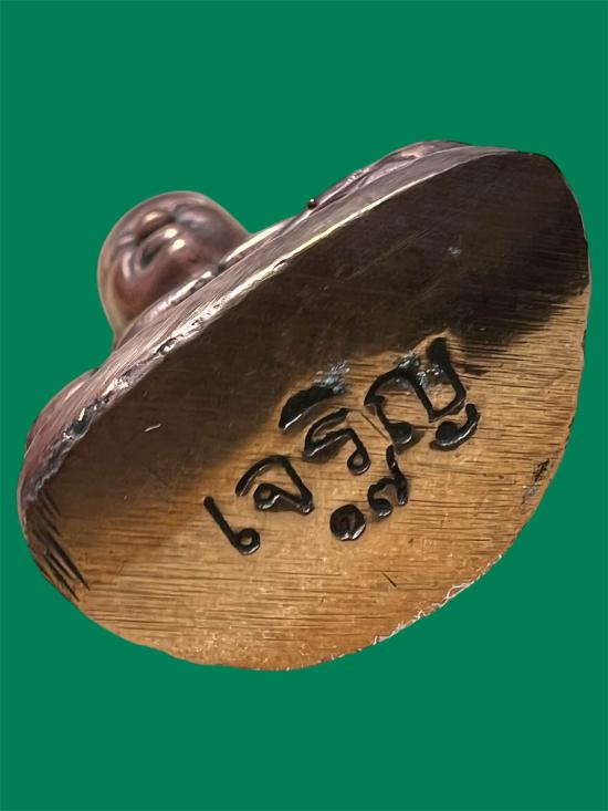 รูปหล่อลอยองค์เนื้อนวโลหะ ก้นตอก และหมายเลขมงคลกำกับใต้ฐาน เจริญตัวเล็ก และเจริญตัวใหญ่ นัยยะแห่งความเจริญอันยิ่งใหญ่ในปัจจุบัน ผิวปัดผ้าลงยาแดงสีนากกลับดำ