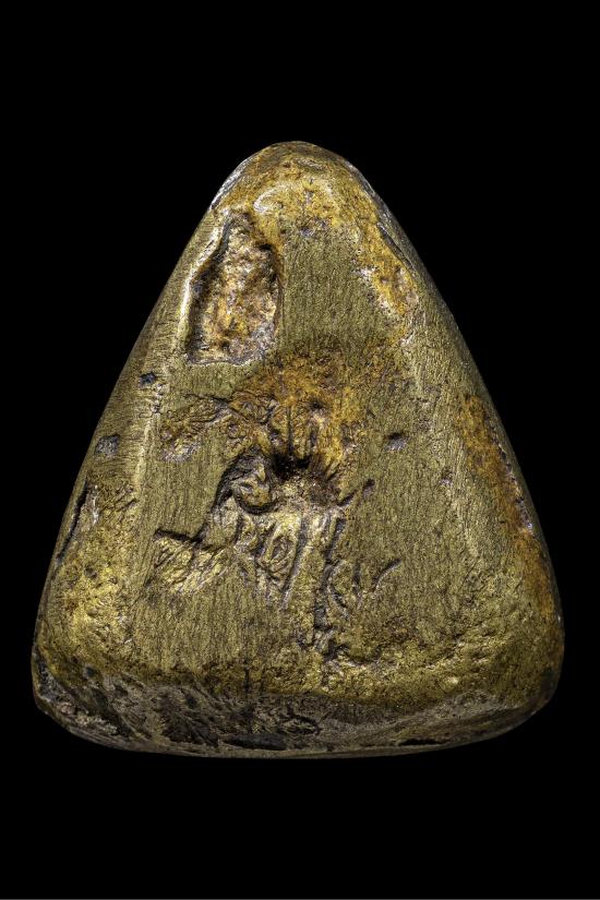 พระปิดตาเนื้อโลหะ เก่าๆ วรรณะเหลืองอมเขียว มีรอยยับย่นธรรมชาติของพระหล่อ |
