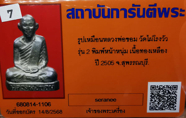 รูปเหมือนหลวงพ่อขอม วัดไผ่โรงวัว รุ่น2 พิมพ์หน้าหนุ่ม เนื้อทองเหลือง กริ่งดัง ปี2505 จ.สุพรรณบุรี + บัตรG-pra สภาพเดิมค่ะ