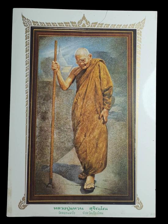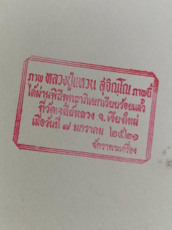 ภาพหลวงปู่แหวน สุจิณโณ ภาพนี้ได้ผ่านพิธีพุทธาภิเษกเรียบร้อยแล้ว ที่วัดเจดีย์หลวง จ.เชียงใหม่ เมื่อวันที่ 7 มกราคม 2521 ขนาดตั้งหรือแขวนบูชา ขนาด 10.5*13 นิ้ว ด้านหลังปั๊มหมึกแดง สภาพสวยเดิม ๆ |