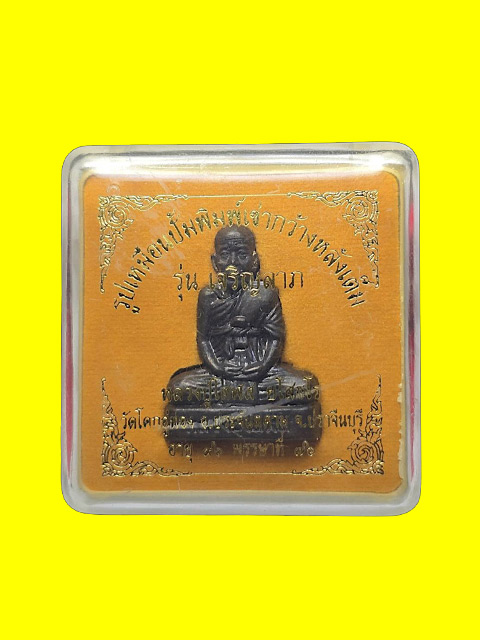***รูปเหมือนปั๊มพิมพ์เข่ากว้างหลังเต็ม เนื้อทองแดงรมดำ รุ่น เจริญลาภ หลวงปู่โสฬส วัดโคกอู่ทอง จ.ปราจีนบุรี พิธีพุทธาภิเษก ครั้งที่ 1 วันแห่งความเป็นหนึ่งในรอบ 50 ปี เมื่อวันที่ 1 แรม 11 ค่ำ เดือน 1 สุดเข้มขลัง เพ่งกสิณไฟจนเทียนน้ำมนต์หมดเล่ม อธิษฐานจิตปลุกเสกสมโภชวัตถุมงคลรุ่นเจริญลาภ ครั้งที่ 2 ภายในอุโบสถวัดโคกอู่ทอง เมื่อวันที่ 9 มกราคม 2554 พระสวดชยันต์โต 8 รูป ปลุกเสกแบบปิดประตูโบสถ์ ให้เป็นมหาอุด เปิดหน้าต่างโบสถ์ ให้เป็นมหาลาภ จำนวนการสร้าง 5,996 องค์***
