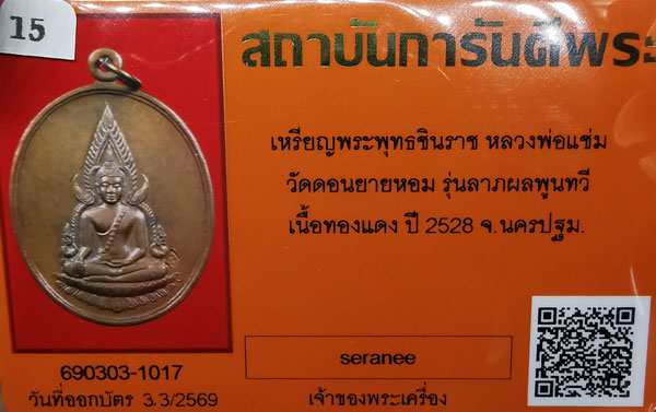 เหรียญพระพุทธชินราช หลวงพ่อแช่ม วัดดอนยายหอม รุ่นลาภผลพูนทวี เนื้อทองแดง ห่วงเดิม ปี2528 จ.นครปฐม + บัตรG-pra สภาพสวยเดิมค่ะ สภาพตามรูปทุกประการค่ะ