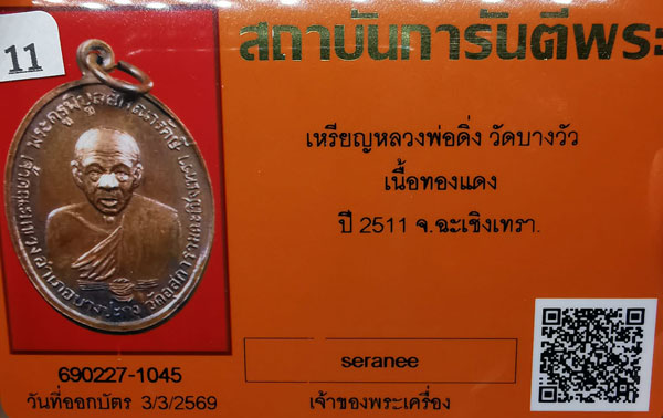 เหรียญหลวงพ่อดิ่ง วัดบางวัว เนื้อทองแดง ห่วงเดิม ปี2511 จ.ฉะเชิงเทรา + บัตรG-pra สภาพเดิมค่ะ |