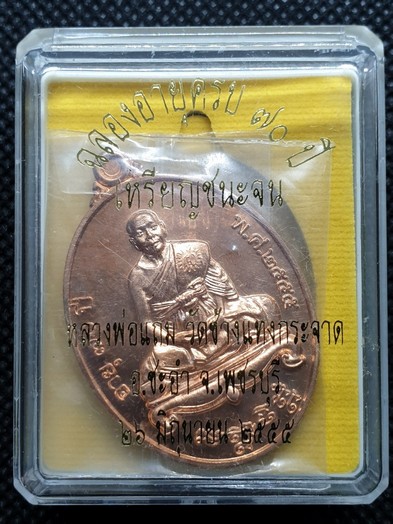 เหรียญชนะจน ปี 2555 หลวงพ่อแถม วัดช้างแทงกระจาด จ.เพชรบุรี เนื้อทองแดง หมายเลข 265 พร้อมกล่องเดิม(ขออนุญาตใช้รูปเจ้าของเก่า)